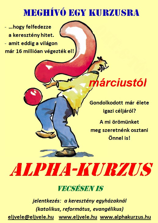 - hogy ne legyenek felszínes benyomásai - hanem saját maga járjon utána, ha véleményt akar a hitről Az Alpha-kurzus: - a kereszténység korrekt bemutatása, már 22.5 millióan elvégezték! - Vecsésen már több mint 100 fő! Vannak, akiknek az életét változtatta meg, egy kiegyensúlyozottabb jövő vár Rád is! Akkor is, ha nem vagy hívő, csak első kézből tájékozódnál a kereszténységről. De akkor is, ha hívő vagy, mert nagyon sokat adhat neked is (még ha gyakorló hívő is vagy!). |