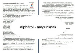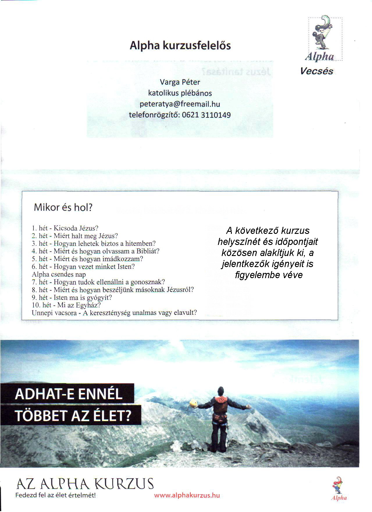 Az év, évek során sok embert hívhatunk meg erre, akik nem járnak templomba, tehát egy nagy lehetőség közösségünk bővülésére is. De azoknak is hasznos, akik már most is hívők. Ha úgy érzed, saját magad is rászorulsz egy átfogó és hiteles áttekintésre a kereszténység lényegéről, akkor neked is ott a helyed; vagy ha csak megerősítést szeretnél. Ha pedig él benned a vágy, hogy más is közelebb kerüljön Istenhez, akkor együtt valósíthatunk meg egy hosszútávú missziós tervet. A kurzus segít az Istennel való kapcsolat kialakításában vagy megerősítésében. Segít megtanítani szívből imádkozni. Segít ráérezni az istengyermekségre. Bizonyára vannak olyan rokonaid, barátaid, ismerőseid, akik távol járnak még a kereszténységtől, és eddig nem akartak veled jönni. Most elhívhatod őket egy jó hangulatú körbe. Ha pedig te magad is részt veszel rajta, akkor lesz igazán ereje a meghívásodnak. Meghívásod első lépéseként javasoljuk odaadni hírlevelünk mellékleteként szereplő sárga lapot. Várunk tehát minden érdeklődőt, azokat is akik már tartoznak valamelyik működő plébániai csoporthoz és azokat is akik még nem. Az Alpha kurzus nem kerül pénzbe, hogy bátran bárkit meg lehessen hívni, de a kurzus folyamán vagy azon kívül is bárki adakozhat vagy hozzájárulhat a vacsorákhoz és egyéb költségekhez. Reméljük sikerült felkeltenünk érdeklődésedet. Kérjük, csatlakozz hozzánk ebben a munkában! Alpha ? - A (a: alpha)– a kezdet és segítség a döntéshez - B (b: béta)– a növekedés az Istennel (pl. katekumenátus)