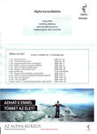 akik Az Alpha-kurzus ideális mindazok számára, akik hiteles forrásból akarnak többet tudni a keresztény hitről és azoknak, akiket csupán az érdekel, hogy milyen valódi tanításai vannak a kereszténységnek. A kurzuson nincsenek elvárásaink, nem kell döntenie, csak nyitottnak kell lenni az információkra és a beszélgetésekre. Magában foglal néhány estét és egy közösen eltöltött jó hangulatú hétvégi napot (vagy igény szerint hétvégét). A kurzust egy team (csapat) fogja vezetni. Tíz héten keresztül minden este vacsorával kezdődik, magában foglal egy előadást és egy lehetőséget arra, hogy közösen beszélgessünk. A helyszín: a jelentkezők igényétől függ (több lehetőségünk van). Az Alpha-kurzus a legsikeresebb keresztény ismertető tanfolyam. Jelenleg is 152 országban folyik, eddig 25 év alatt 13 millió ember vett rajta részt! (sőt az idő haladtával egyre többen és többen....) Ha érdekli, kérjen prospektust és bemutató dvd-t tőlünk; ha szívesen jön, kérjen színes jelentkezési lapot. Ha szívesen jönne, de tavasszal nem alkalmas Önnek, akkor is jelezze ezt nekünk, hogy később számítani tudjunk Önre! Várakozással nézünk elébe, hogy találkozzunk! Beosztás: